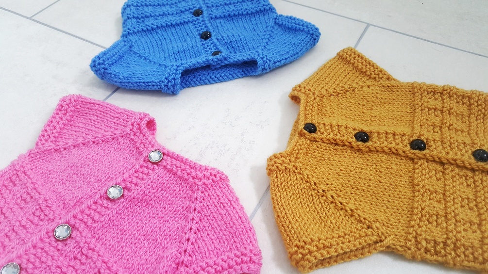 This is a top-down raglan shaped cardigan, designed for two sizes of preemie babies (medium & large). For ease and speed the collar, hems, and button band are all knitted as you go.