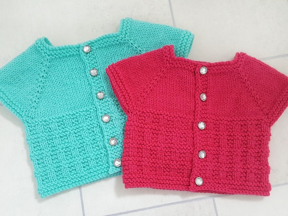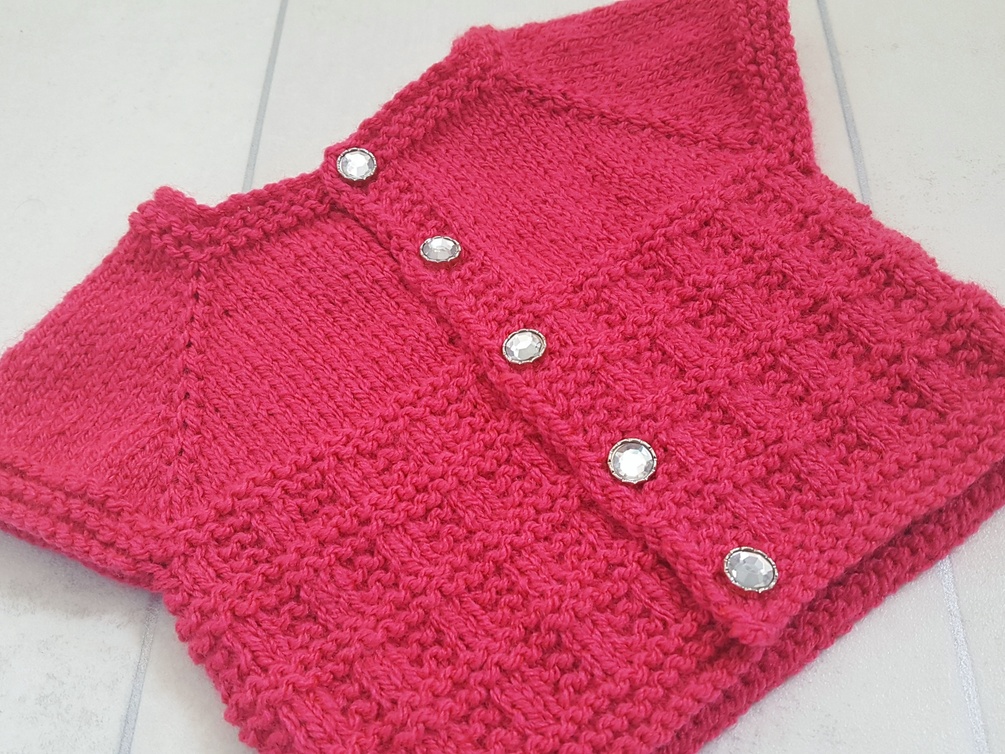 This is a top-down raglan shaped cardigan, to continue up in sizes from my Preemie Broken Checkerboard Cardigan. For ease and speed the collar, hems, and button band are all knitted as you go.